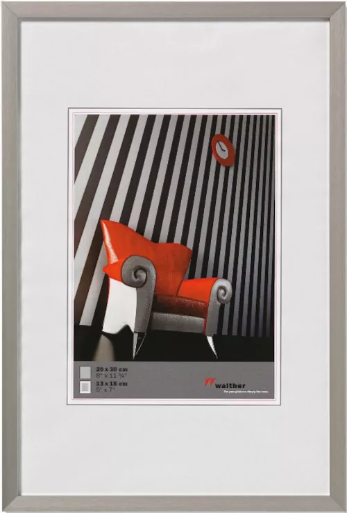 Der Alurahmen Chair hat ein Blockprofil mit matt gebürsteter Oberfläche in 5 verschiedenen Farben. Der Rahmen Chair von der Bilderrahmenmarke Walther kommt bis zur Größe 20 x 30 cm mit Aufsteller und ab 40 x 50 cm mit Galerieaufhängung.