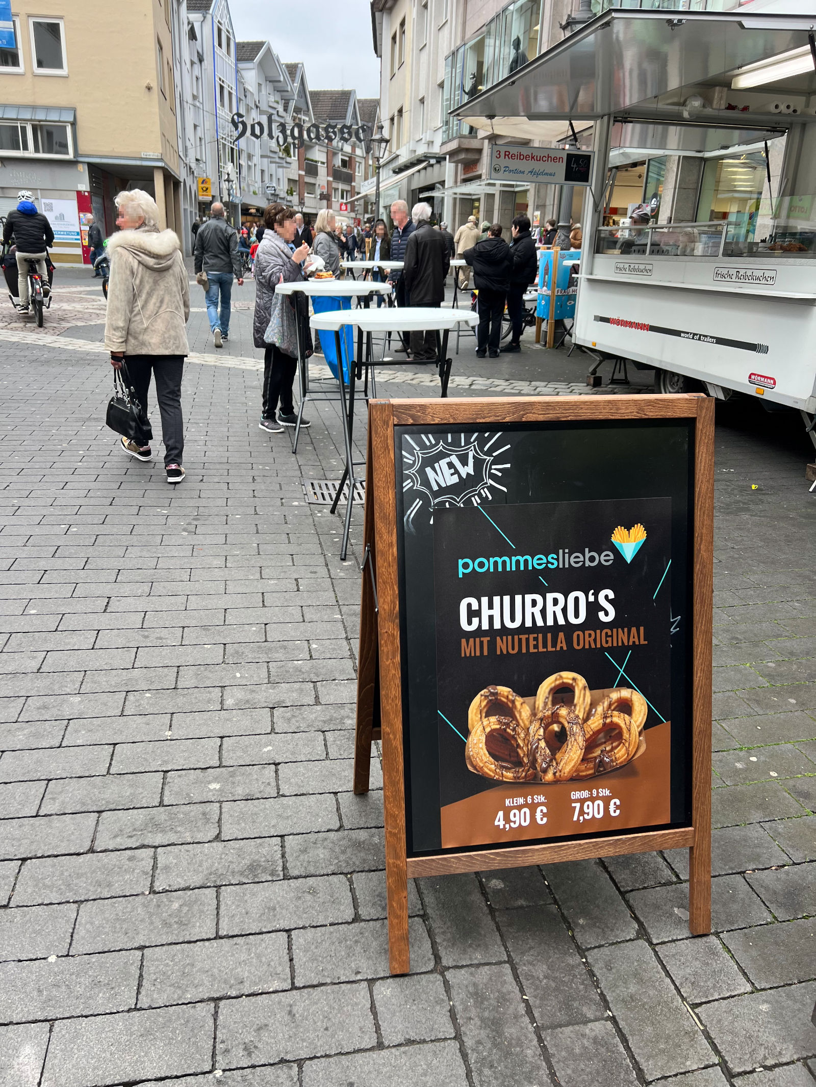 Mit seinem massivem Holzrahmen und der großen Werbefläche setzt der elegante und hochwertig hergestellte Gehwegaufsteller MULTIvon UpdateDisplays deutliche Akzente.