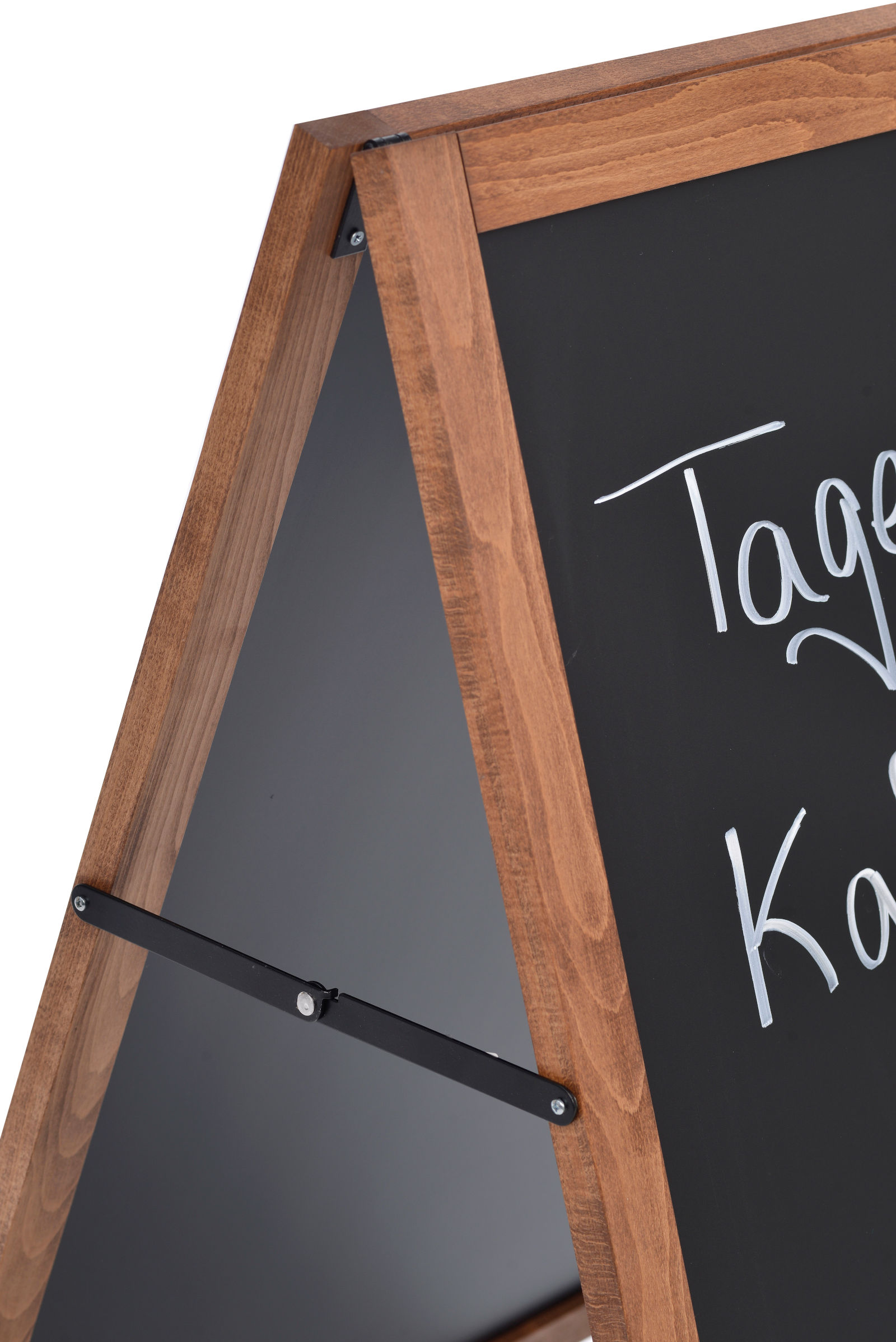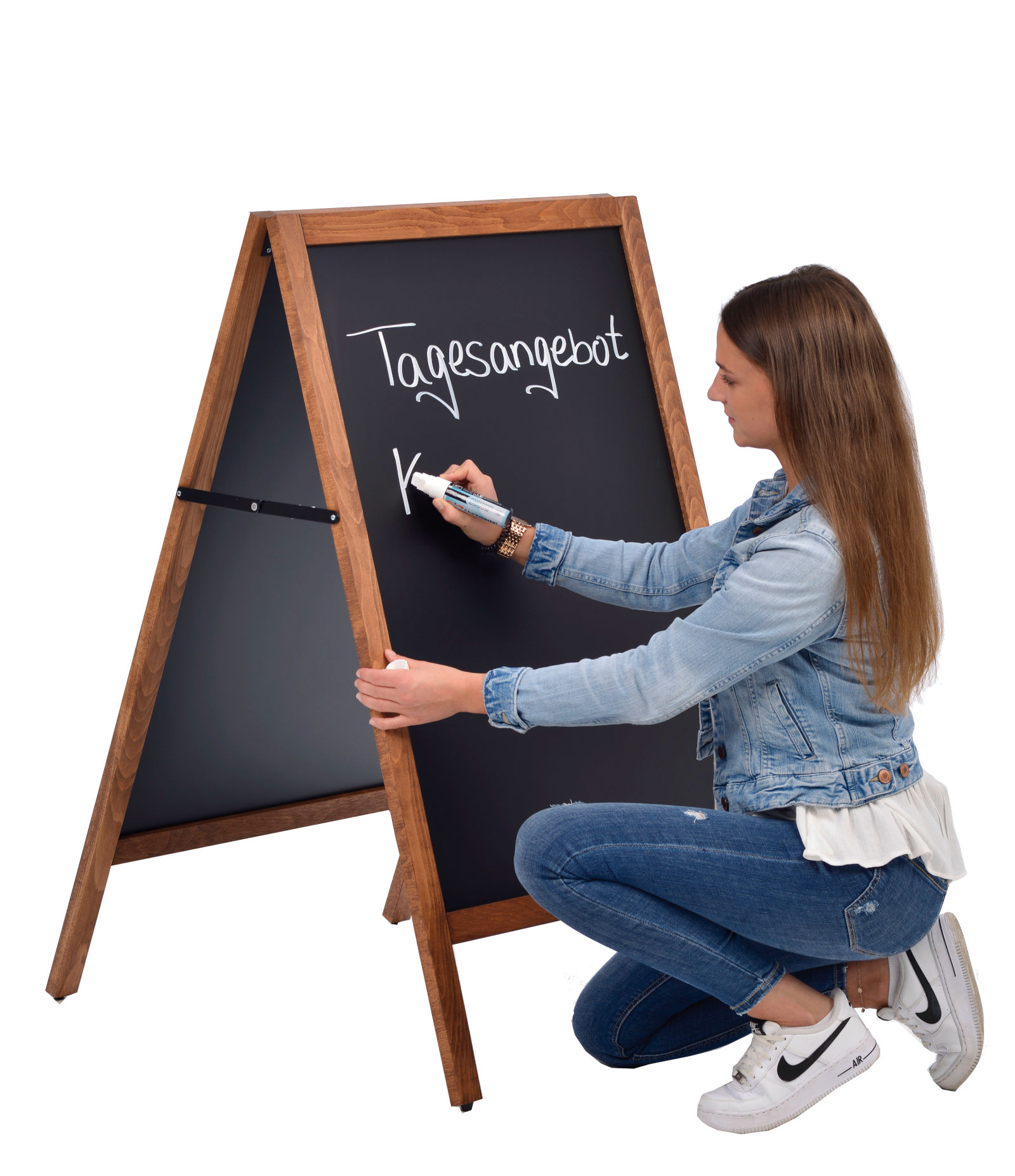 Die robuste, kratzfeste Tafeloberfläche lässt sich gut mit Kreide oder Kreidemarkern beschriften und auch wieder reinigen. Prädestiniert für häufig wechselnde Angebote wie in Biergärten, Eisdielen, usw.