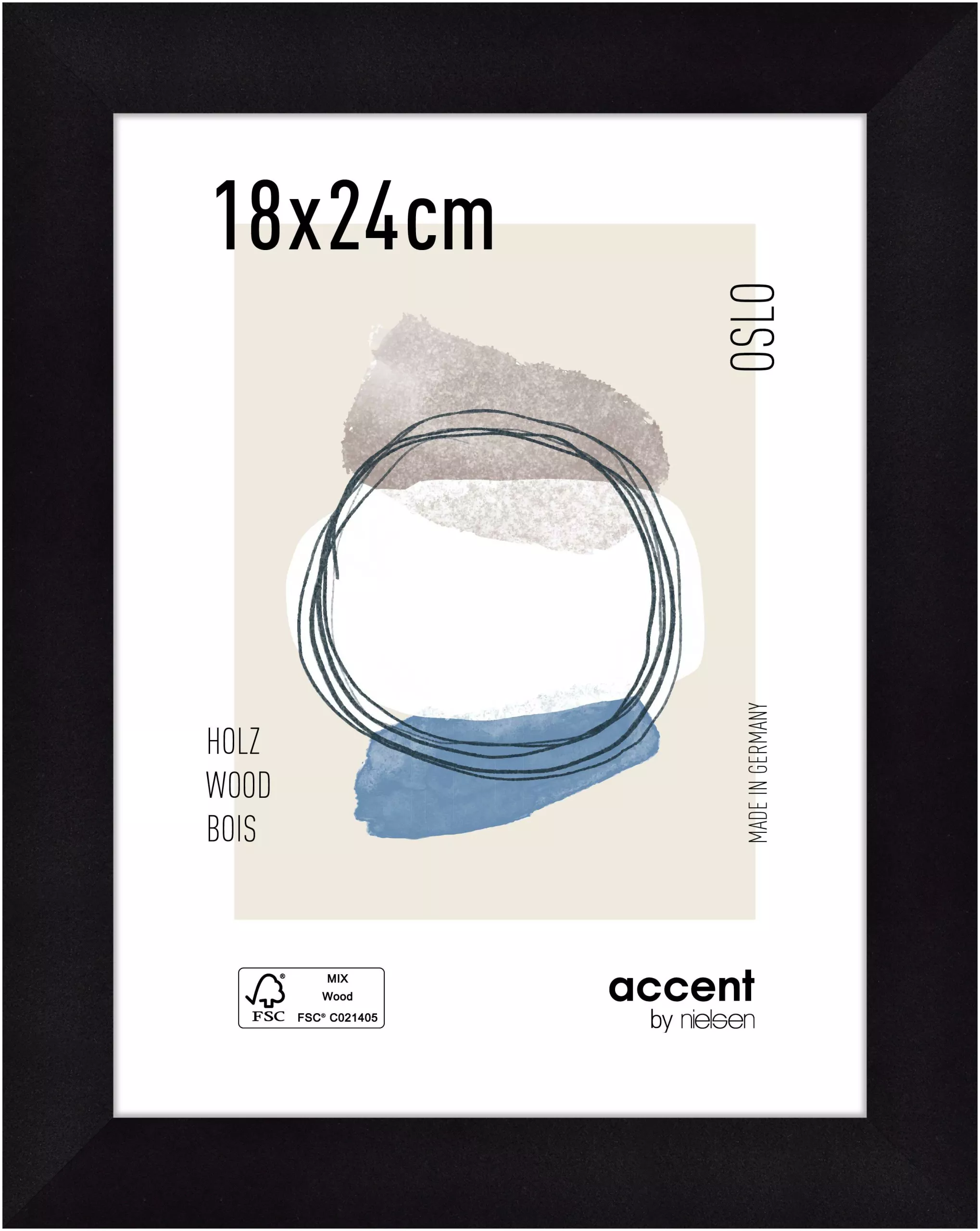 Der Accent Holz-Bilderrahmen Oslo von Nielsen Design ist eine hochwertige Holzrahmenleiste im modernen Stil zum Einrahmen von Bildern, Dokumenten, Fotos und mehr. Dieser Bilderrahmen wird in Deutschland aus 100% FSC®-zertifizierten Holz gefertigt und eignet sich für moderne Wohnlandschaften, Büros oder professionelle Rahmungen. Die Leiste fügt sich dabei in verschiedenste Stile ein. Die Fotoformate 13 x 18 cm und 18 x 24 cm kommen mit einem Aufsteller auf der Rückwand. Die Rahmen Aufhänger im Hoch- und Querformat.