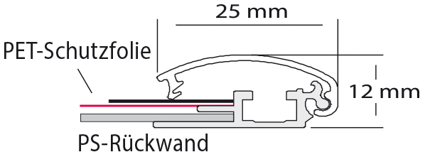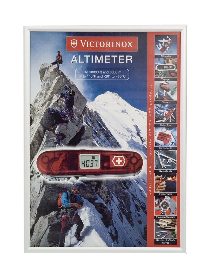 Mit dem stilvollen, silber eloxierten Aluminium-Klapprahmen 25mm wird der Austausch der Plakate schnell und ohne Mühe erledigt. Einfach die Aluminium-Profile aufklappen, das Plakat wechseln, Profile zuklappen und fertig!